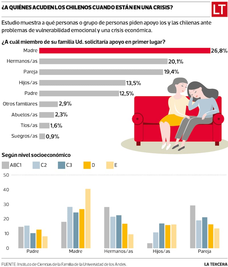 El estudio mostró que la madre es señalada por todos los grupos socioeconómicos como la primera persona a quien se le pide apoyo, excepto el grupo socioeconómico ABC1, que da su primera opción a su pareja (29%) y a sus hermanos (28%).