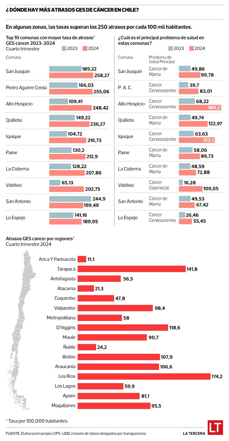 Uno de los hallazgos más importantes es que, aunque las cifras varían por territorio, hay patrones comunes: San Joaquín, por ejemplo, casi duplicó su tasa de atraso en cáncer de mama entre 2023 y 2024, mientras que en Quillota el alza fue aún mayor. En el norte, Alto Hospicio e Iquique viven un escenario crítico con el cáncer cervicouterino, donde las tasas de atraso superaron los 150 por cada 100 mil habitantes. En Valdivia, en tanto, el cáncer colorrectal es el problema más grave, con un salto de más de 80 puntos en solo un año.