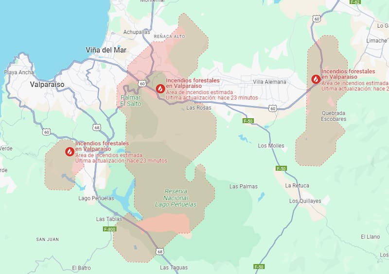 El reciente siniestro de la Región de Valparaíso presenta diferentes focos de incendio, pero los de mayor preocupación por su rápido avance e intensidad, corresponden al siniestro en Complejo Las Tablas, Viña del Mar, que ha consumido 9.379 hectáreas y el segundo foco es en Lo Moscoso, Quilpué, de 1.350 hectáreas.