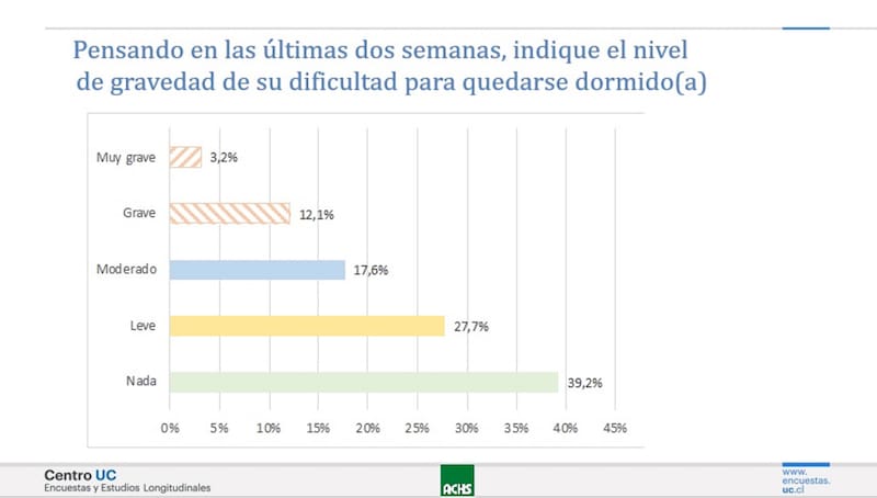Al indicar la gravedad en cuanto a la dificultad para permanecer dormido, un 12,9% de la población entre 21 y 68 años reportó tener problemas graves o muy graves para permanecer dormidos en agosto 2021. El 45,9% admite no tener ninguno. Y si se trata del nivel de gravedad de despertarse más temprano que lo deseado, lo reconoce el 13,8%.
