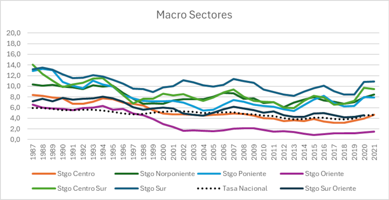 “Todos los macro sectores muestran tasas que son menores a las que exhibían en 1987. Dicho eso, el fenómeno que sí se advierte es que las tasas de homicidios en las comunas del oriente de Santiago bajan a un ritmo acelerado, generando una importante divergencia entre el Santiago acomodado y el resto”, sostiene Obregón.