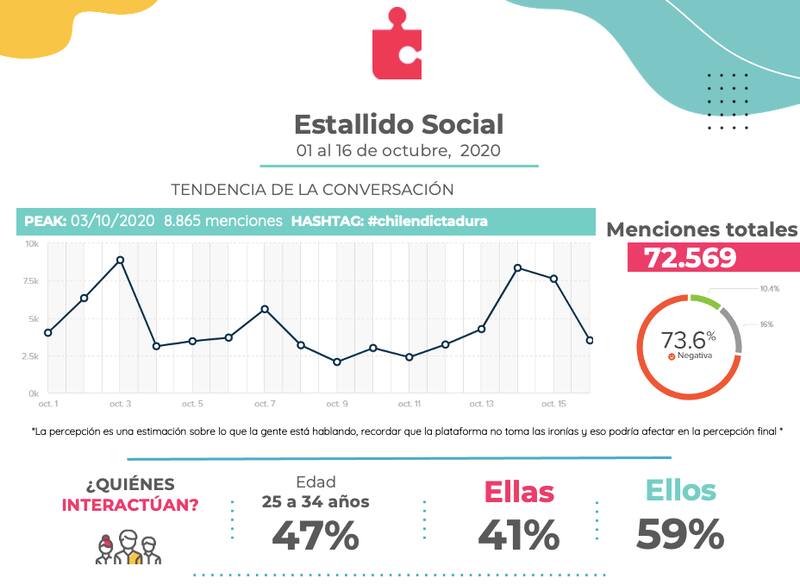 Entre el 1 y el 16 de octubre, el peak de las conversaciones en torno al tema fue el 3 del mismo mes, con el hashtag #chilendictadura, con 72.569 menciones totales, y una percepción negativa de 73,6%. La edad mayoritaria de participación fue entre 25 a 34 años, con un 59% hombres vs 41% mujeres.