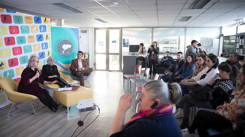 Durante la jornada, el Programa Asociativo Regional (PAR) Explora de la UMAG, organizó un encuentro más íntimo en el espacio American Corner. “Micrófono abierto con las científicas del Congreso Futuro 2023″ contó con las expertas internacionales Katrina Johnston - antropóloga estadounidense especializada en espacios públicos - y Catriona McKinnon - politóloga inglesa - quienes expusieron ante el público y luego respondieron sus preguntas.