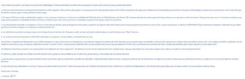 La información agrega que “por lo tanto el aislamiento no es para evitar contagiarse, es para turnarse en el contagio. El Gobierno y redes sociales han evitado transmitir esto de manera clara. Gracias por su tiempo, un abrazo”.
