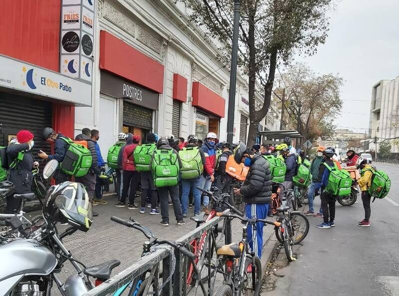 A la hora de almuerzo de este jueves un gran número de personas que realizan labores de traslado a través de las aplicaciones Rappi y Uber, se agolparon en una de las sucursales de la cadena de comida rápida Mc Donald´s, ubicada en calle Bellavista, en la comuna de Providencia.