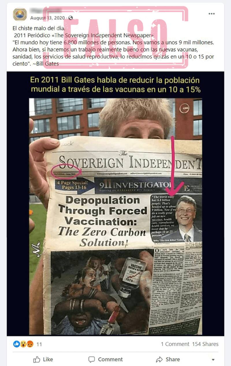 Con respecto a la portada del diario que afirmaría que la pandemia estaba planificada, Muena sostiene que esta desinformación tiene varios orígenes distintos, pero el más utilizado es la charla Ted que hizo Bill Gates en 2015 que tuvo bastante impacto cuando la realizó porque hablaba de la próxima pandemia.