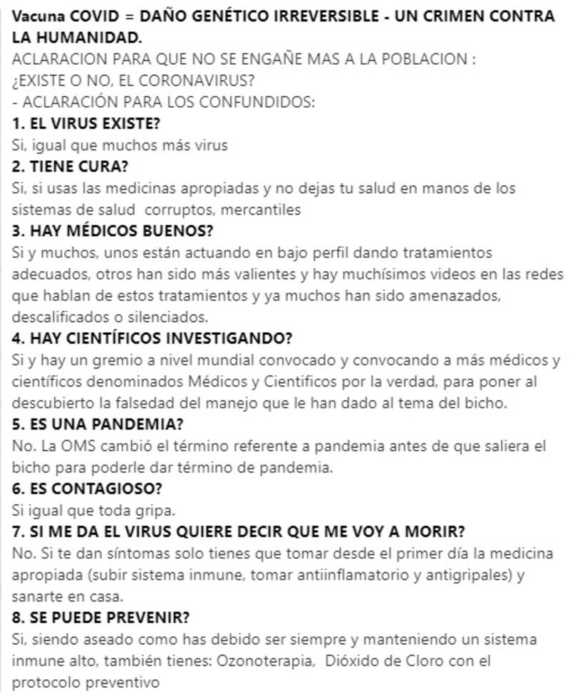 Luego prosigue: ¿El virus tiene cura? sí, si usas las medicinas apropiadas y no dejas tu salud en manos de los sistemas de salud corruptos, mercantiles, ¿el coronavirus no es una pandemia? no, la OMS cambió el término referente a pandemia antes de que saliera el “bicho” para poderle dar término de pandemia, ¿el coronavirus fue creado en un laboratorio para restringir libertades y cambiar el sistema económico? sí, el virus fue creado con el fin de ser la excusa para restringir libertades, cambiar el sistema económico actual por uno más opresivo y esclavizante, establece el mensaje.