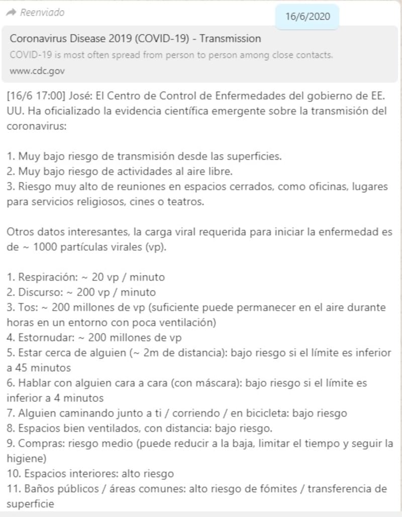 Así, añadía varios ejemplos de cuántas “partículas virales” producen distintas acciones como respirar, lo que produce 20 vp / minuto o toser, que genera 200 millones de vp, lo suficiente, según el mensaje, para permanecer en el aire durante horas en un entorno con poca ventilación.