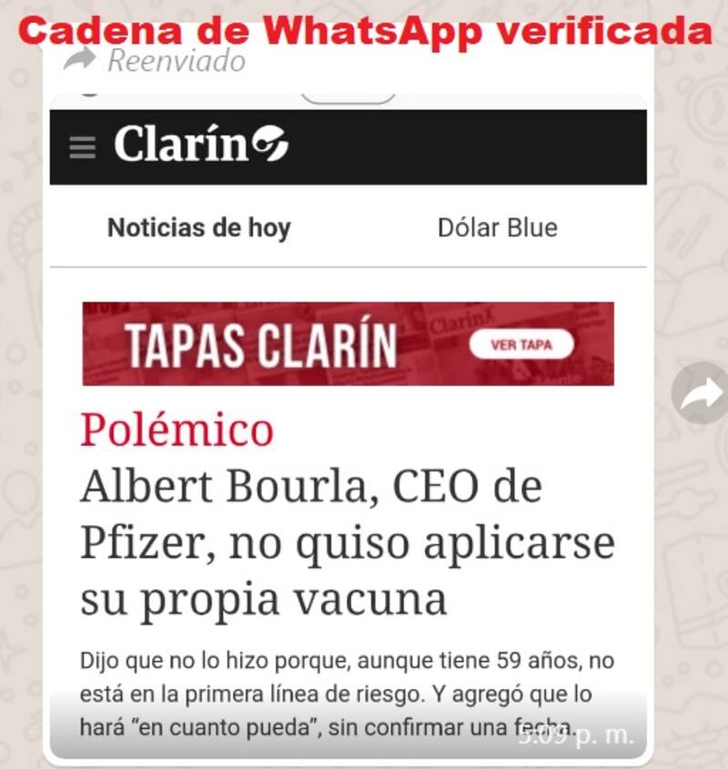 Una noticia que circula en redes sociales, señal una supuesta publicación del diario argentino Clarín, donde establece que Albert Bourla, CEO del laboratorio Pfizer, no quiso vacunarse contra el Covid-19.