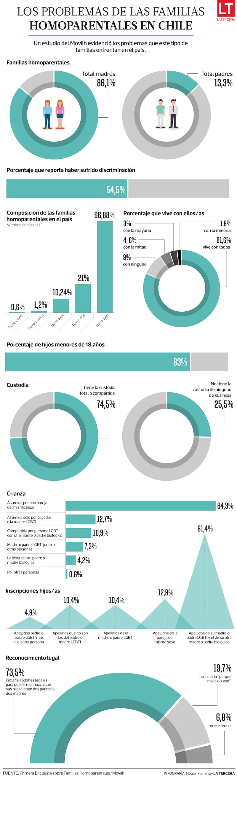 Esa fue la pregunta que buscó responder la Primera Encuesta sobre Familias Homoparentales aplicada por el Movimiento de Integración y Liberación Homosexual (Movilh) a madres y padres LGBTI. Los resultados muestran que existen desigualdades y discriminación que las afecta en su mayoría: el 54,5% reporta haber sufrido discriminación y denuncia al Registro Civil como la entidad donde enfrentan más problemas.