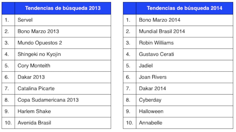 Las búsquedas a través de los años dan cuenta de cómo va cambiando el interés de los usuarios por diversos temas, desde realities, muertes de famosos hasta los bonos ofrecidos por el Gobierno, el estallido social y la actual pandemia de coronavirus.