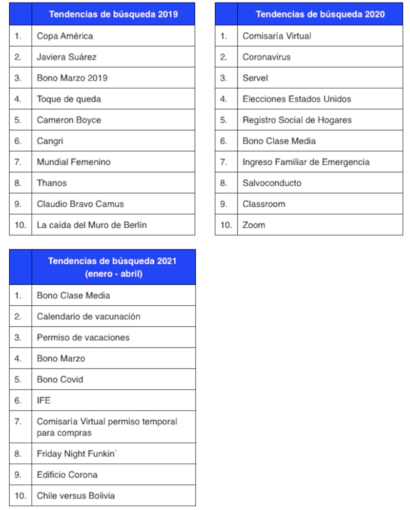 Recientemente, en 2019 y 2020, las consultas en el buscador local de Google estuvieron marcadas por los movimientos sociales, la pandemia del Covid-19 y cómo enfrentar el virus y la llamada “nueva normalidad”. Así, durante estos años destacan términos tales como toque de queda, salvoconducto, coronavirus e Ingreso Familiar de Emergencia. Y en el caso de 2021 (entre los meses de enero y el 20 de abril) se imponen las búsquedas relacionadas con la pandemia y sus múltiples aristas. En este sentido, en los primeros lugares del listado se encuentran términos como Bono Clase Media, calendario de vacunación y permiso de vacaciones.