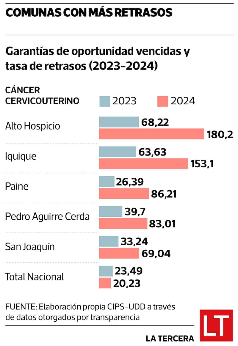 Aunque a nivel nacional los atrasos GES en cáncer cervicouterino han disminuido levemente, persisten fuertes aumentos en comunas específicas como Alto Hospicio, Iquique, Paine y Pedro Aguirre Cerda, donde las tasas de espera se han duplicado o triplicado entre 2023 y 2024.