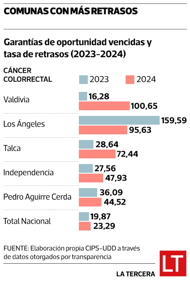 El cáncer colorrectal es actualmente el segundo con más retrasos GES en Chile, con un aumento sostenido en todas las etapas del proceso. Entre 2019 y 2024, los atrasos en diagnóstico se multiplicaron por 8 y los de tratamiento por 5 veces, alcanzando más de 2.500 y 700 casos respectivamente.