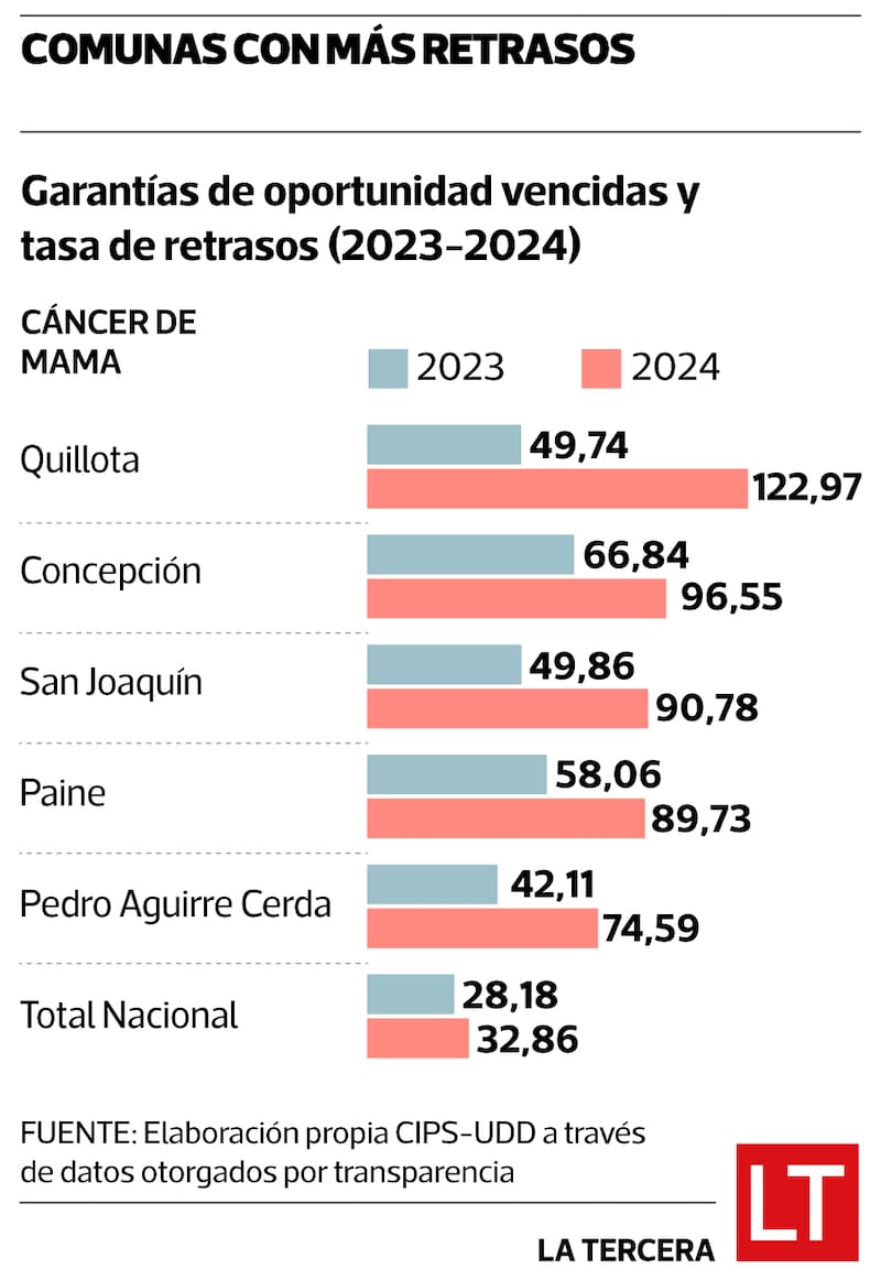 Entre 2019 y 2024, los atrasos en diagnóstico se multiplicaron por 8,2 veces, los de tratamiento por 5 veces, y los de seguimiento por 15,5 veces. Las regiones más golpeadas son Biobío, O’Higgins y Valparaíso, y comunas como Quillota, Concepción y San Joaquín han duplicado o triplicado sus tasas de espera.