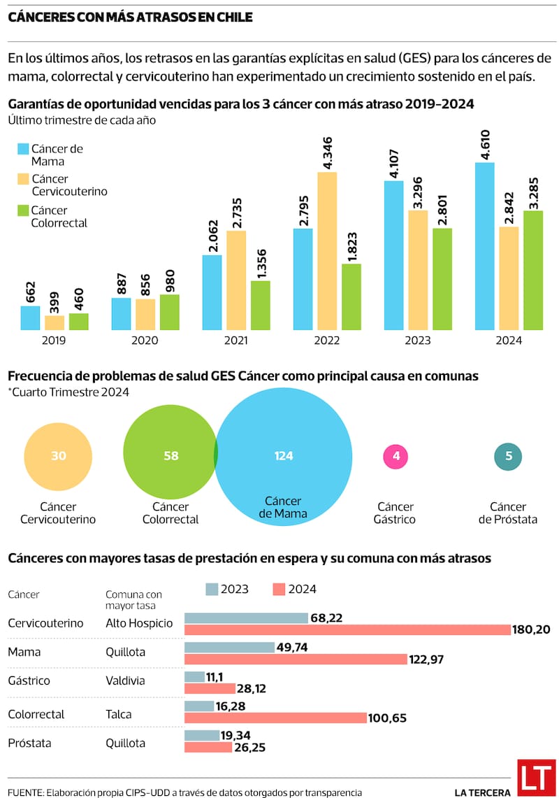 Durante el cuarto trimestre de 2024, el análisis, realizado por el CIPS-UDD, que consideró solo comunas con cinco o más casos pendientes, mostró que, el cáncer de mama lideró los atrasos, afectando a 124 comunas, seguido por el colorrectal (58 comunas) y el cervicouterino (30 comunas), evidenciando una grave crisis en la oportunidad de diagnóstico, tratamiento y seguimiento para miles de pacientes en el sistema público de salud.