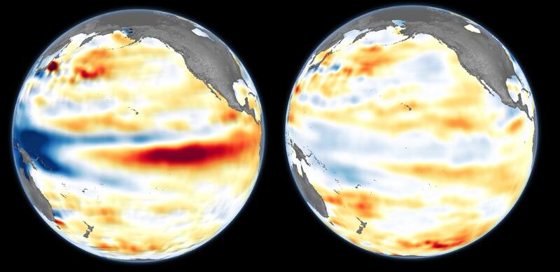 Y eso es lo precisamente que han logrado medir los satéliteles de las más importantes agencias científicas del mundo, que a traves de sesnores especializados, logran “colorear” el Pacífico según las temperaturas promedio del mar, como muestra este mapa comparativo de la Nasa.