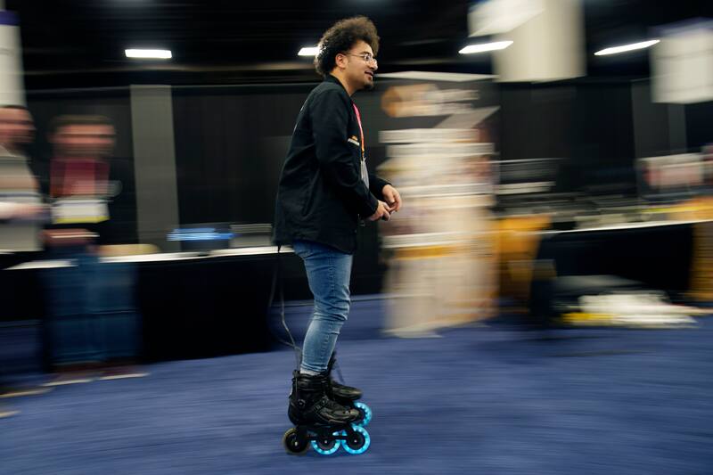 Los periodistas se divirtieron recorriendo la sala de exposiciones en los patines en línea eléctricos a control remoto de la empresa emergente francesa AtmosGear. La batería dura 32 kilómetros, dijo el fundador Mohamed Soliman, quien espera que la gente los vea como una forma viable de viajar, como bicicletas eléctricas o scooters.