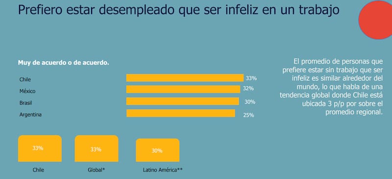 Sin embargo, otro resultado que llama la atención es que ante la aseveración “prefiero estar desempleado que ser infeliz en un trabajo”, sólo un 33% declara estar de acuerdo, cifra que se encuentra dentro del promedio y que habla de una tendencia global. Un escenario que se logra ver con más claridad al analizar los datos por generación.
