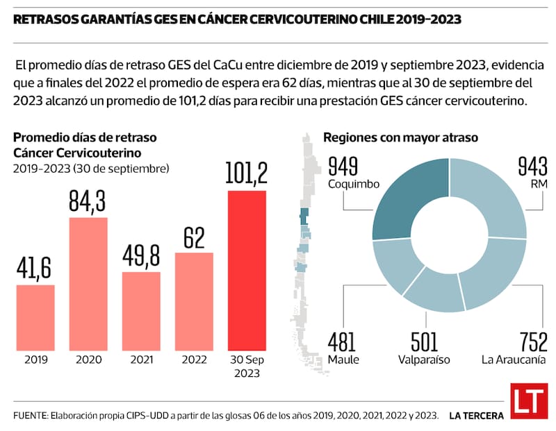 Esta lista se ha ido engrosando en los últimos años. Entre fines del año 2022 y el segundo trimestre del 2023 (corte de los datos al 30 de junio), los retrasos de cáncer cervicouterino disminuyeron en solo 0,87% (de 4.343 a 4.305), manteniéndose como la garantía GES de cáncer con mayor cantidad de retrasos registrados.