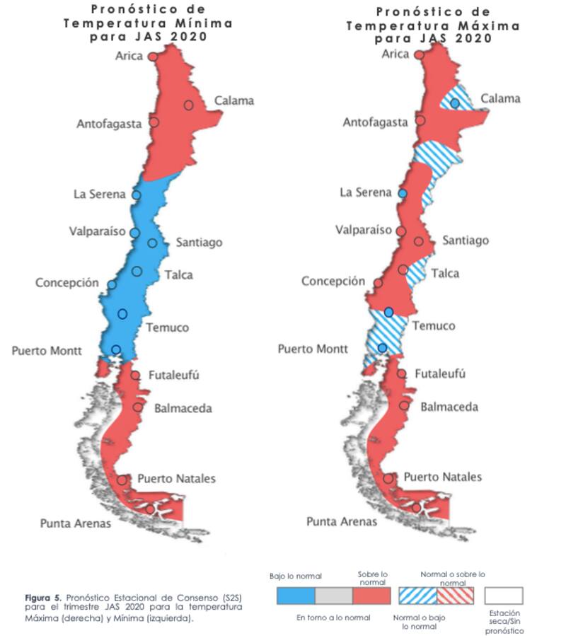 Bajo lo normal: Curicó, Talca, Linares, Cauquenes, Chillán, Concepción, Los Ángeles y Cochrane.