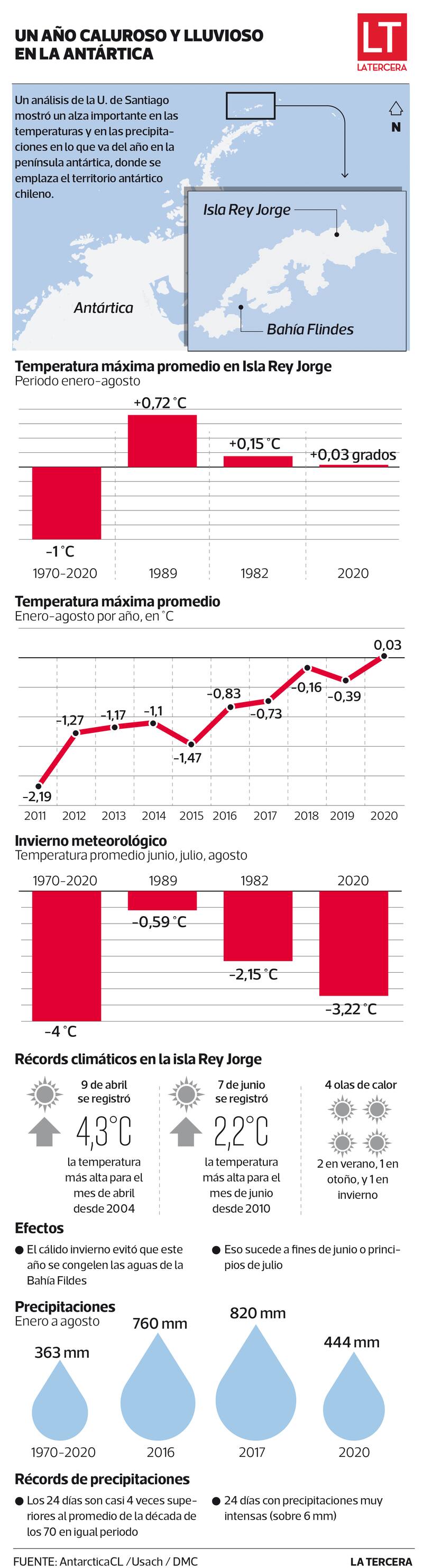 Según la investigación, liderada por el climatólogo Raúl Cordero y sobre la base de datos obtenidos en la Base Escudero de Instituto Antártico Chileno (Inach), en la isla Rey Jorge (zona norte del continente), el período enero-agosto de 2020 es el tercero más cálido, solo superado por 1982 y 1989, con temperaturas máximas en promedio de más de un grado durante el invierno, respecto a valores considerados normales.