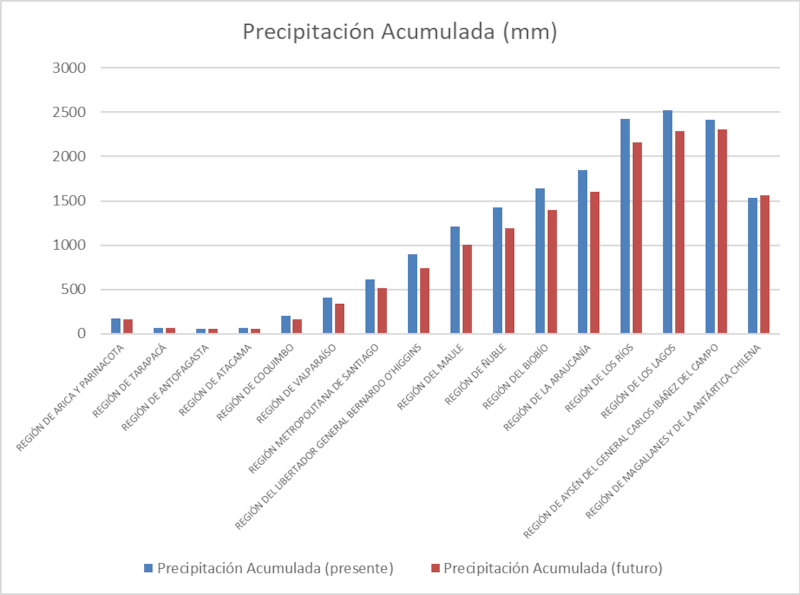 También, se espera que la precipitación acumulada disminuya en gran parte del país (entre las regiones de Atacama y Aysén), y que entre las regiones de Coquimbo y Ñuble esta disminución sea entre 16% y 17%.