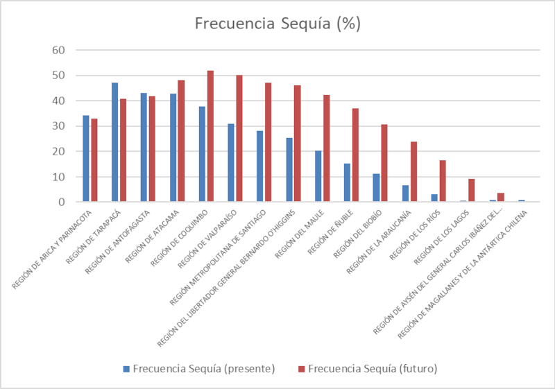 Adicionalmente, se establece en el futuro (2035-2065) aumente la frecuencia de sequía en gran parte del territorio nacional sobre todo entre las regiones de Atacama y Aysén. Se proyecta que 180 comunas tendrán 40% o más de frecuencia de sequía en el futuro (sobre todo en las regiones de Coquimbo, Valparaíso, Metropolitana, O´Higgins, Maule), y que en 122 comunas el aumento en la frecuencia de sequía (diferencia entre el presente y el futuro) sea de más del 20% (Valparaíso 18, Metropolitana 17, O´Higgins 28, Maule 30, Ñuble 15).