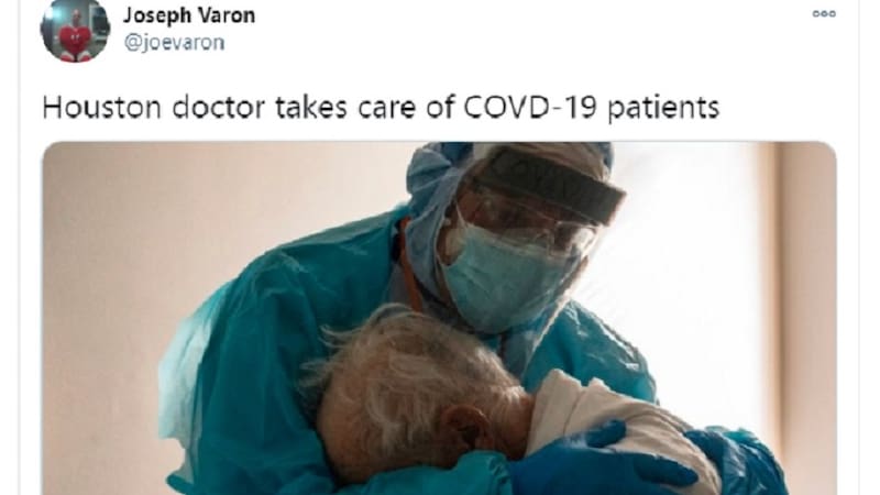 La foto muestra a Varon, vestido con equipo de protección, abrazando a un paciente que se derrumbó en sus brazos.