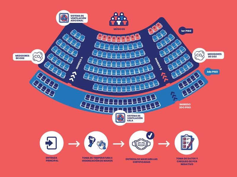 Como estudio científico deben cumplirse normas y etapas a cargo de la U. de Chile. Entre ellas, la toma de PCR previo al concierto, que los asistentes cuenten con esquema de vacunación completo y el pase de movilidad activo, el uso de mascarillas en todo momento y sin excepción, higienización de espacios (sanitización de butacas y escenario antes del concierto); higienización de manos, medición de CO2 a través de medidores creados por la U. de Chile (ver infografía), además de presentar al comité de ética institucional el consentimiento informado.