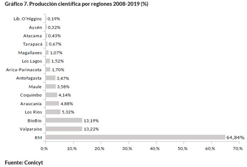 El documento establece, en relación a la producción científica nacional entre 2008 y 2019, que existe una enorme desigualdad entre el financiamiento para investigación que se destina a la Región Metropolitana y el resto del país. La geografía de Chile es una invitación perfecta para pensar la distribución de la investigación de acuerdo con necesidades específicas de los territorios. Sin embargo, Chile se piensa desde Santiago y se destinan pocos recursos para las zonas que necesitan con mayor urgencia que se piensen sus modelos productivos y ambientales, establecen los autores del informe.