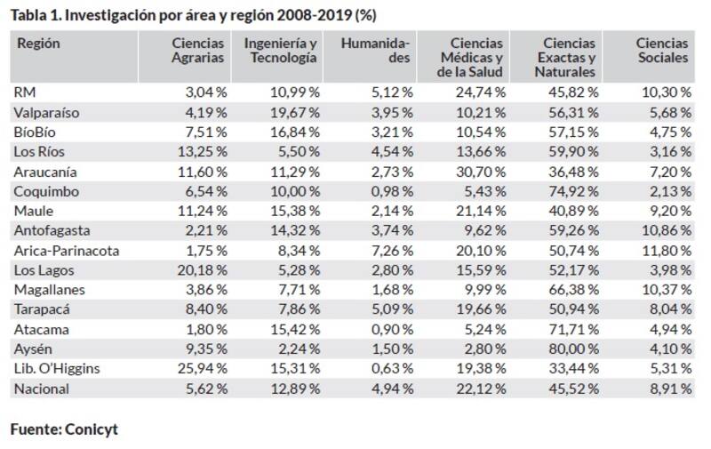 En la siguiente tabla se evidencia la desigualdad de financiamiento por áreas de investigación y la realidad de cada región. La falta de planificación hace que espontáneamente los recursos tiendan a asignarse a ciertas áreas que tienen que ver con el desarrollo local, sin embargo, de modo general, en cada región se reproduce una desigualdad disciplinaria, siguiendo la tendencia de Santiago, explica el documento.
