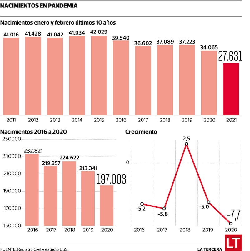 Como Jorge, miles de chilenos han decidido aplazar la paternidad, como lo refrendan las cifras del Registro Civil, que durante los meses de enero y febrero de 2021 registró el número de nacimientos más bajo de los últimos 10 años para estos meses (ver infografía). Entre ambos meses se contabilizaron 27.631 nacimientos, cifra que en los mismos meses de 2020 fue de 34.065, en un claro y directo impacto de la pandemia.