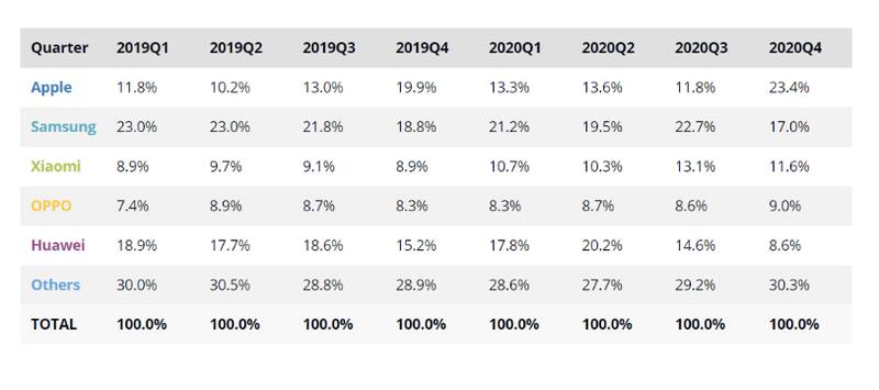 Samsung lideró el mercado con el 23% de los dispositivos vendidos, seguido de Apple, con el 17%. Les siguieron tres fabricantes chinos: Xiaomi (15%) y Oppo y Vivo (11% cada una).