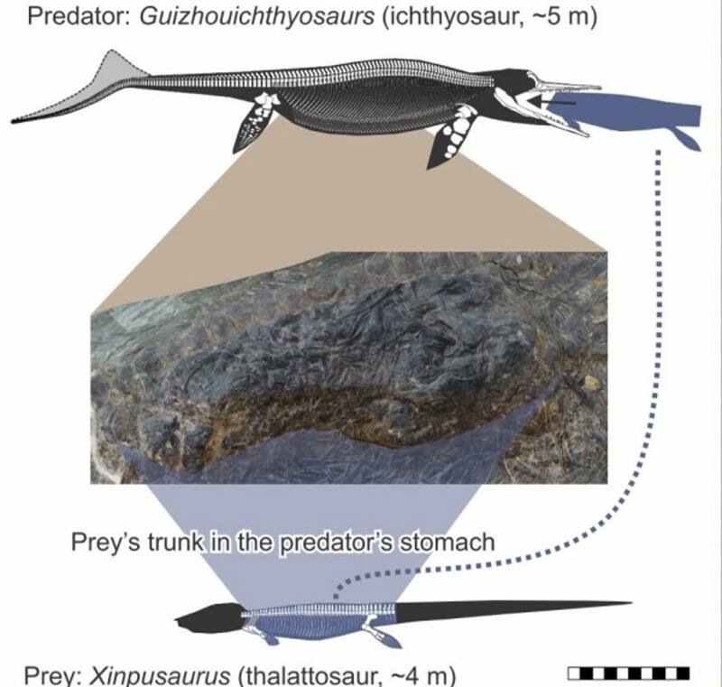 Cuando se descubrió un espécimen del ictiosaurio Guizhouichthyosaurus en la provincia de Guizhou, en China, en 2010, los investigadores notaron una gran protuberancia de otros huesos dentro del abdomen del animal.