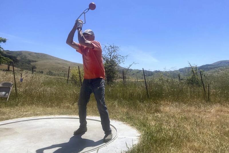 El ranchero Mike Gale, de 81 años, instaló un círculo de lanzamiento de atletismo en su extensa propiedad en Petaluma, California, para que él y algunos amigos pudieran practicar el lanzamiento del disco y otros equipos. Contra un telón de fondo de ondulantes colinas verdes, giran, pisan, lanzan y recuperan una y otra vez.