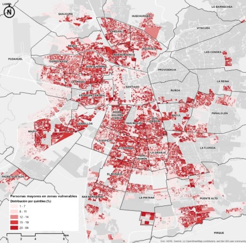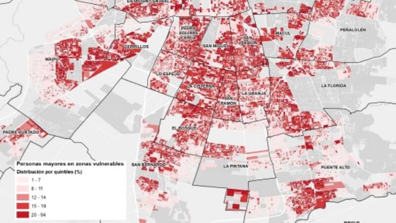 La investigación reveló que el 65% de las personas mayores del Gran Santiago se localizan en zonas con mayor vulnerabilidad, esto es, difícil acceso a áreas verdes, hospitales, comercio y transporte público, entre otras variables indispensables en la vida actual.