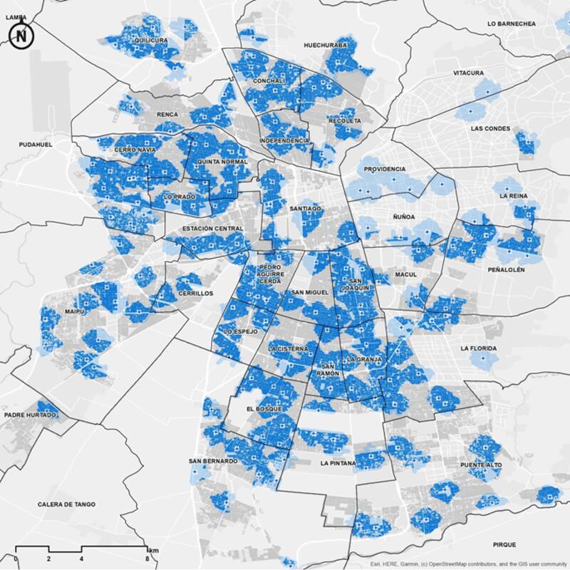 Además, las personas mayores del Gran Santiago que residen dentro de zonas vulnerables se encuentran en lugares donde hay carencias en la accesibilidad a espacios de recreación. Solo el 16% se encuentra a 15 minutos caminando de un parque urbano y el 21% de un establecimiento cultural.