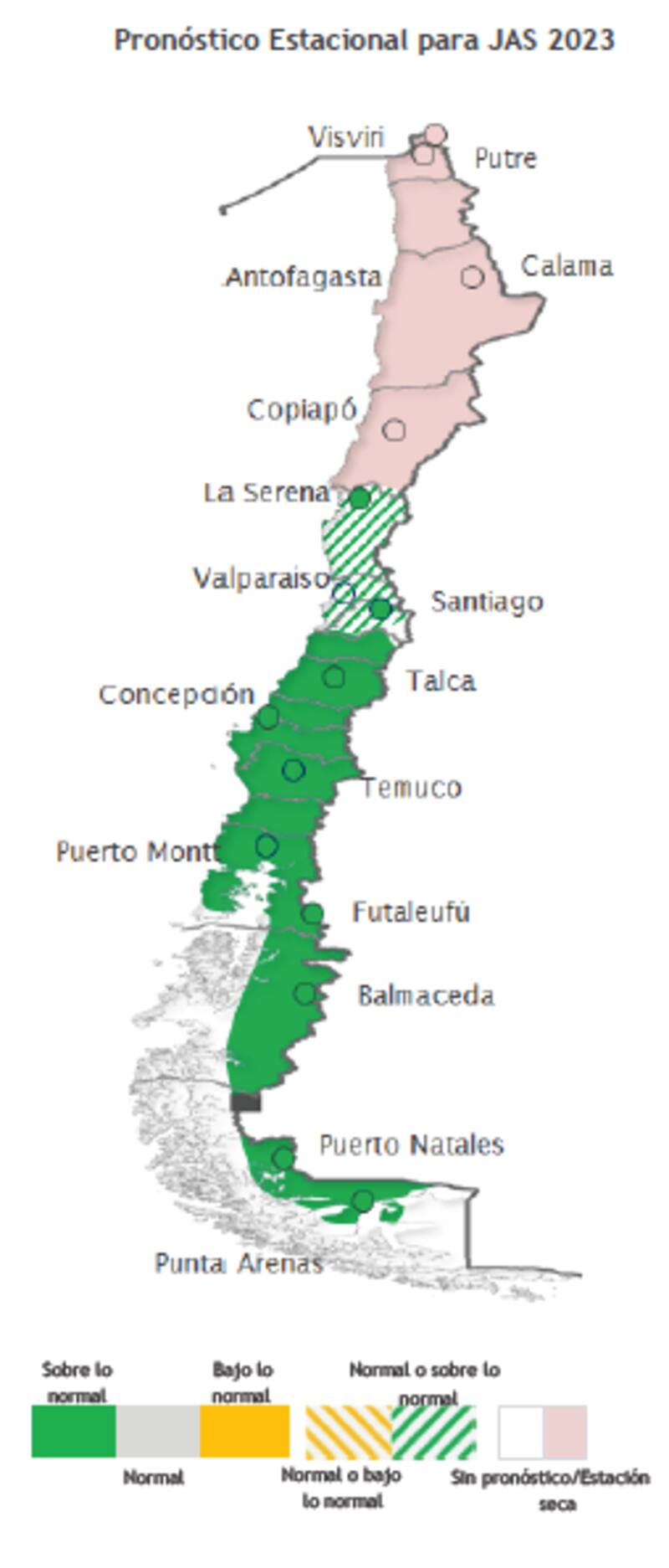 Por ejemplo, en Talca debiesen registrarse más de 254 mm, en Concepción más de 435 mm y en Puerto Montt más de 510 mm. Entre la Región de Coquimbo y la Región Metropolitana el pronóstico presenta un mayor grado de incertidumbre. A pesar de esto, indica una tendencia hacia una condición “normal” a “sobre lo normal”. Esto implicaría que en Santiago se supere el umbral superior de normalidad para el trimestre de 155 mm, añade el informe.