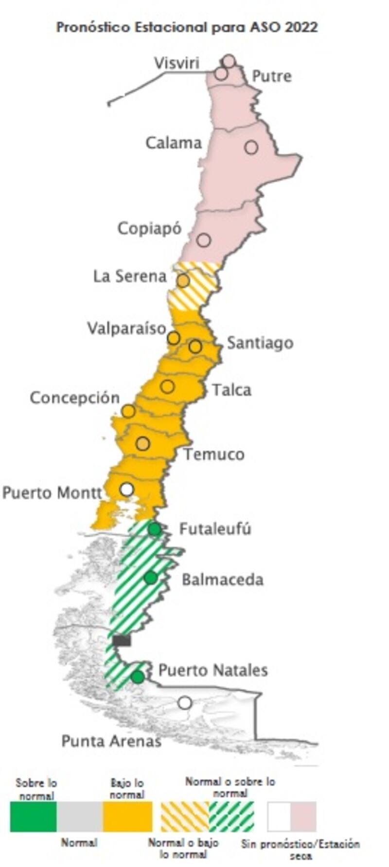 Al igual que los últimos pronósticos estacionales, sigue dominando una condición “Bajo lo Normal” en el tramo entre el sur de la región de Coquimbo hasta la Región de los Lagos.