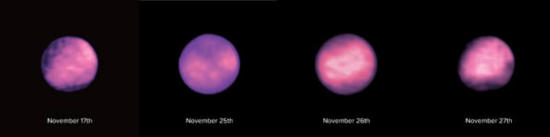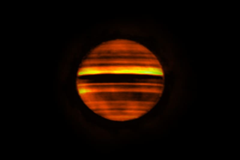En 2019, los astrónomos usaron los datos de ALMA para revelar las entrañas de Júpiter, donde pudieron observar torbellinos de nubes, grandes anillos coloridos y enormes tormentas. La atmósfera de Júpiter ha deslumbrado incontables veces por su belleza y su vorágine. ¿Pero qué sucede debajo de sus nubes? ¿Qué provoca las numerosas tormentas y erupciones que vemos en la superficie de ese planeta? Para saberlo, no basta la luz visible; los investigadores tuvieron que observar Júpiter en ondas de radio. Un nuevo conjunto de imágenes de radio obtenidas por ALMA proporcionó una vista sin precedentes de la atmósfera de Júpiter hasta 50 kilómetros debajo de su manto de nube visible.