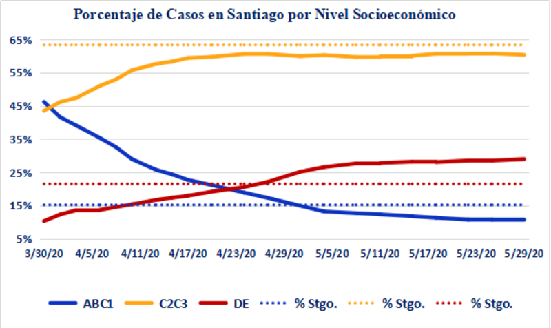 Debido a lo anterior, a fines de marzo, la mitad de los casos de Santiago estaba en los barrios ricos, que representan menos del 12% de la población de la capital chilena. Un mes más tarde, el 85% de los casos ya estaba en el resto de Santiago (ver gráfico), siendo seguramente el vector principal las asistentas del hogar. El coronavirus había hecho un pequeño entretiempo antes de empezar su festín, el que también está ocurriendo a nivel mundial.