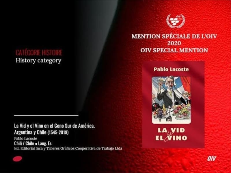 El libro fue escrito por el académico del Instituto de Estudios Avanzados (Idea) de la Universidad de Santiago, Pablo Lacoste, que gracias a este texto, logró el único reconocimiento para Latinoamérica de la edición 2020 de los Premios de la Organización Internacional de la Viña y el Vino (OIV), una especie de “Fifa” de la industria vitivinícola.