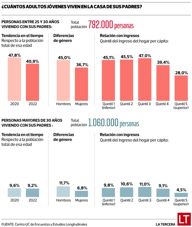 Un análisis realizado por David Bravo, del Centro de Encuestas y Estudios Longitudinales de la U. Católica, realizado para Qué Pasa, muestra que en 2022, se observó que 792 mil personas entre 25 y 30 años (40,9% de ese grupo etario) vivían con sus padres. Esta cifra mostró una reducción significativa comparada con el período entre 2003 y 2020, donde la tasa de cohabitación era del 47,8%. También, se identificó aquellos en hogares con ingresos del 40% superior tenían menos probabilidades de hacerlo que los de ingresos más bajos.