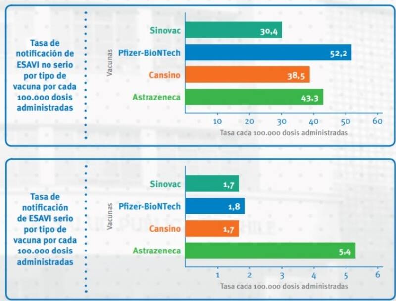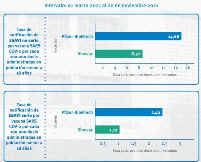 En la población pediátrica, son dos las vacunas aprobadas las que se están administrando en el país: Sinovac y Pfizer. En números totales, la fórmula de la farmacéutica china acumula 319 notificaciones, pero al calcular en tasa, registra 9,63 registros por cada 100 mil vacunas; mientras que Pfizer (con 248 notificaciones totales), llega a 17,18 por cada 100 mil dosis, casi el doble que Sinovac.