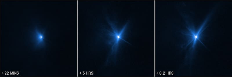 Hubble también capturó observaciones del sistema binario antes del impacto, luego nuevamente 15 minutos después de que DART golpeara la superficie de Dimorphos. Las imágenes de la cámara de campo amplio 3 del Hubble muestran el impacto en luz visible. Los eyectados del impacto aparecen como rayos que se extienden desde el cuerpo del asteroide. El pico de eyección más audaz y desplegado a la izquierda del asteroide está en la dirección general desde la que se acercó DART.