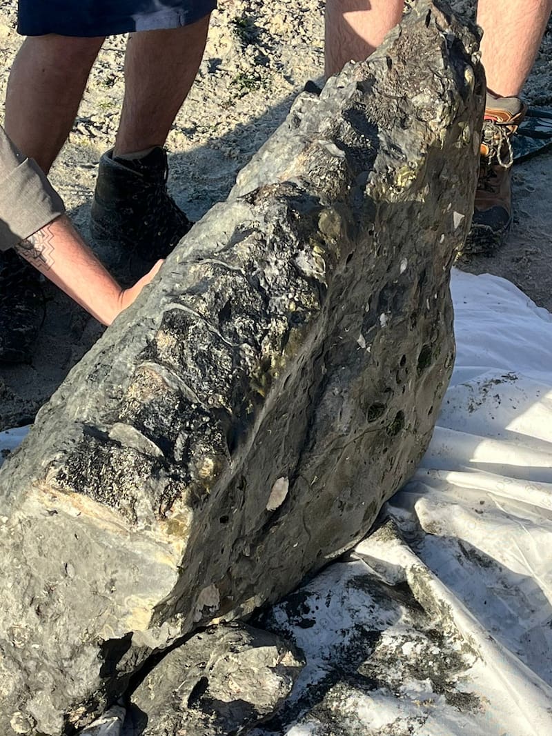 Señala que si bien el hallazgo se realizó en mayo de 2022, y fue encontrado por Jana Toscheva, vecina de Algarrobo, el material fue recién excavado la semana pasada (27-30 de noviembre), recuperándose múltiples bloques de roca que contienen los huesos fosilizados.