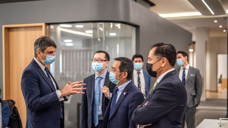 En el encuentro participaron junto a sus equipos asesores el vicepresidente de la farmacéutica Sinovac, Weining Meng, el director de InvestChile, Andrés Rodríguez, y el académico de la Universidad Católica y director del Instituto Milenio de Inmunología e Inmunoterapia, Alexis Kalergis.