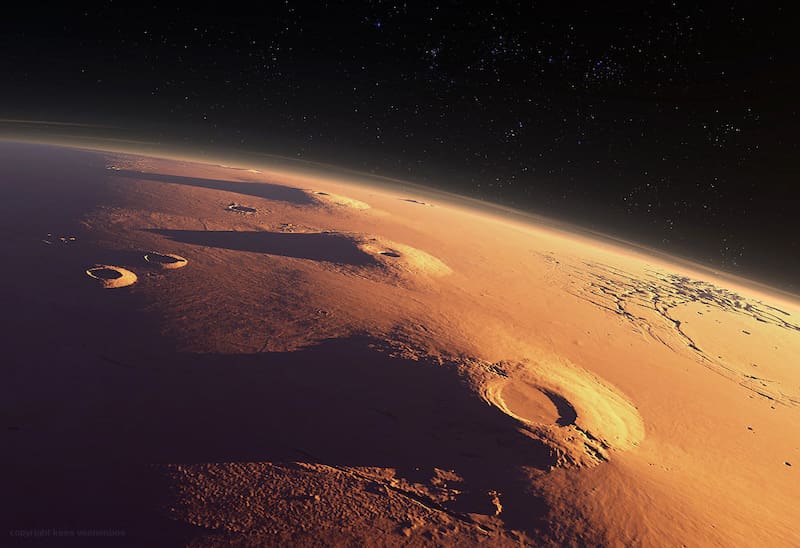 Arsia Mons y otros dos volcanes forman lo que se conoce como los Montes Tharsis, que suelen estar rodeados de nubes de hielo de agua (a diferencia de las nubes de dióxido de carbono, igualmente comunes en Marte), especialmente a primera hora de la mañana. Esta panorámica marca la primera vez que se ha fotografiado uno de los volcanes en el horizonte del planeta, ofreciendo la misma perspectiva de Marte que los astronautas tienen de la Tierra cuando observan desde la Estación Espacial Internacional.