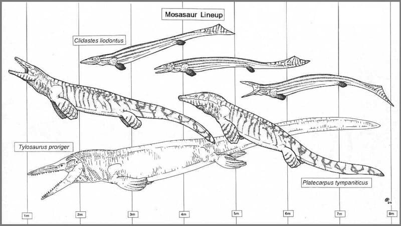 Los mosasaurios son gigantescos reptiles marinos que se distribuyeron en los mares de todo el mundo durante el Cretácico, en especial, durante los últimos 20 millones de años de este periodo.
